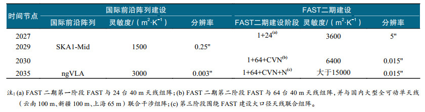 FAST作为世界顶级射电望远镜,虽在诸多方向取得重要成果,但FAST的局限性也日益显现。FAST二期工程概念的提出,旨在发展低成本、快速实施的阵列升级方案。计划到2027年,在FAST周边5 km内建设24台40 m口径天线,组网形成综合孔径阵列,灵敏度达到3600 m2/K;2030年底,在30 km内再建设40台同等口径天线,组成FAST二期,增强成像能力和空间分辨率。升级后的FAST将与国内其他大型全可动单天线联合工作,实现15 mas的分辨率和6400 m2/K的灵敏度,约为ngVLA的2倍。FAST二期工程不仅提升灵敏度,还将增强高分辨率成像能力,显著推进时域天文、遥远星系中性氢探测、宇宙大尺度结构、暗能量等前沿研究。