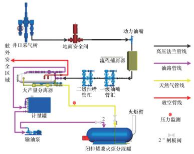 [2]。因此,要达到进气田生产流程要求,通常要求清喷排液周期长,而长时间占用钻井船排液作业成本高,无法实现降本增效。同时,海上高温高压气井排液流程受海上狭窄空间限制,无法实现像陆地排液管线一样布置,需要在保证安全的前提下精简排液流程及设备,而排液过程中管线节流效应,通常会形成水合物,结合返出流体携带的固相常常会造成管线堵塞,从而导致流程超压、地面管线冲蚀泄漏。以上问题都给高温高压低渗气田清喷排液带来极大的挑战